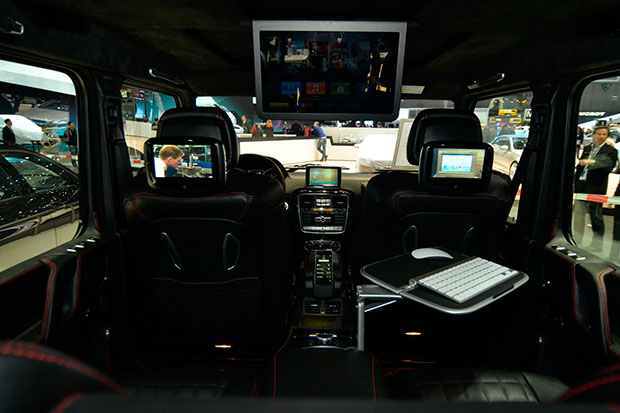 Trata-se do Brabus 800 iBusiness, uma personalização de primeira do Mercedes-Benz G65 AMG que, resumindo, é um escritório de luxo ambulante regado a produtos da Apple.