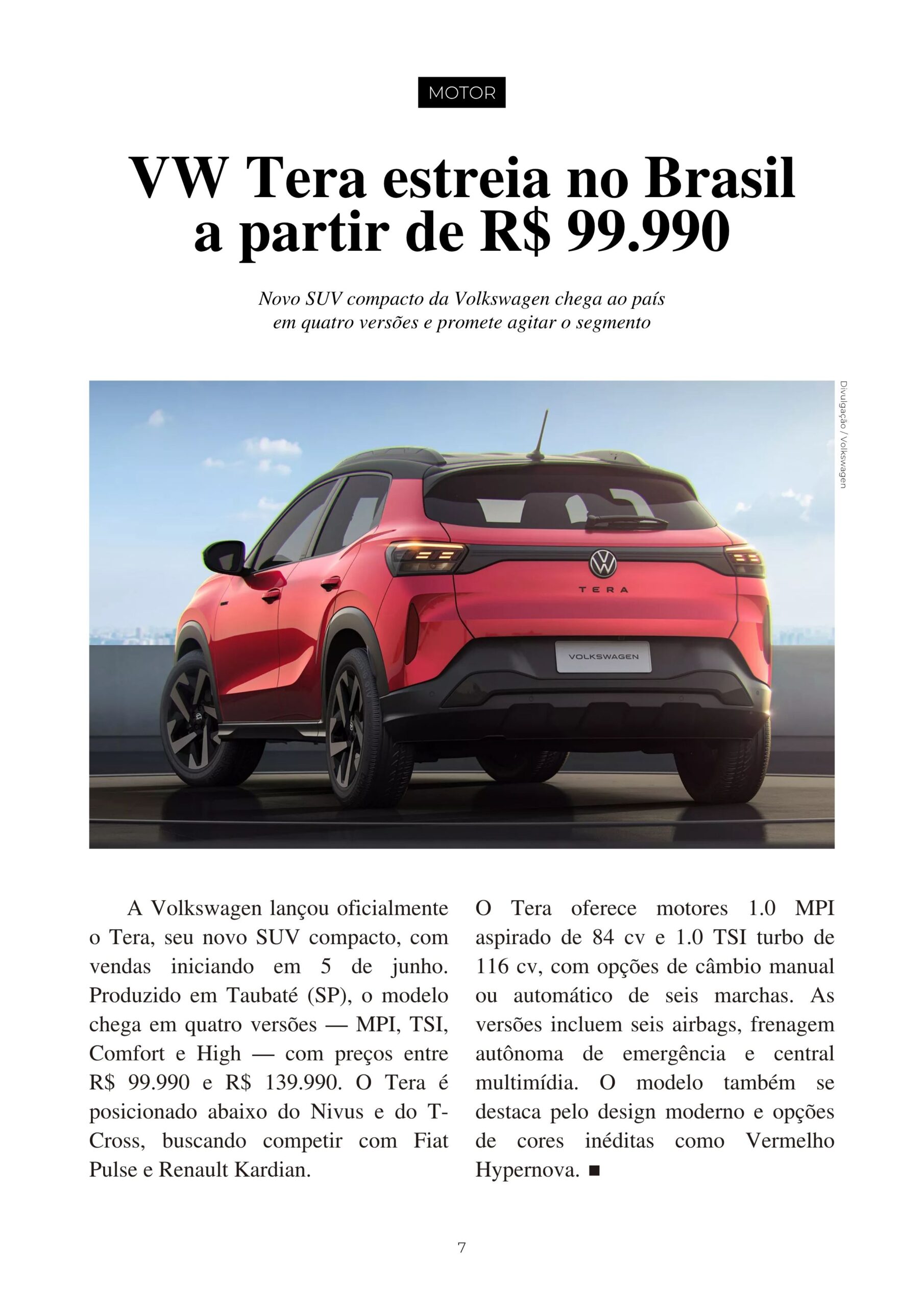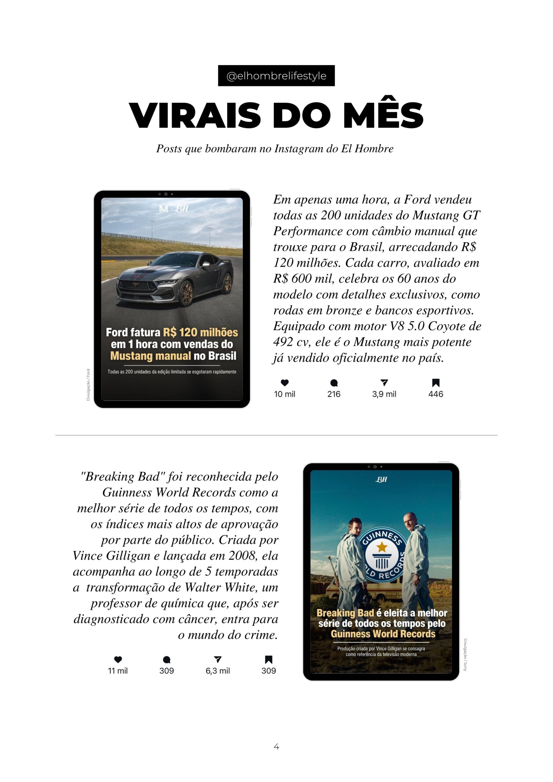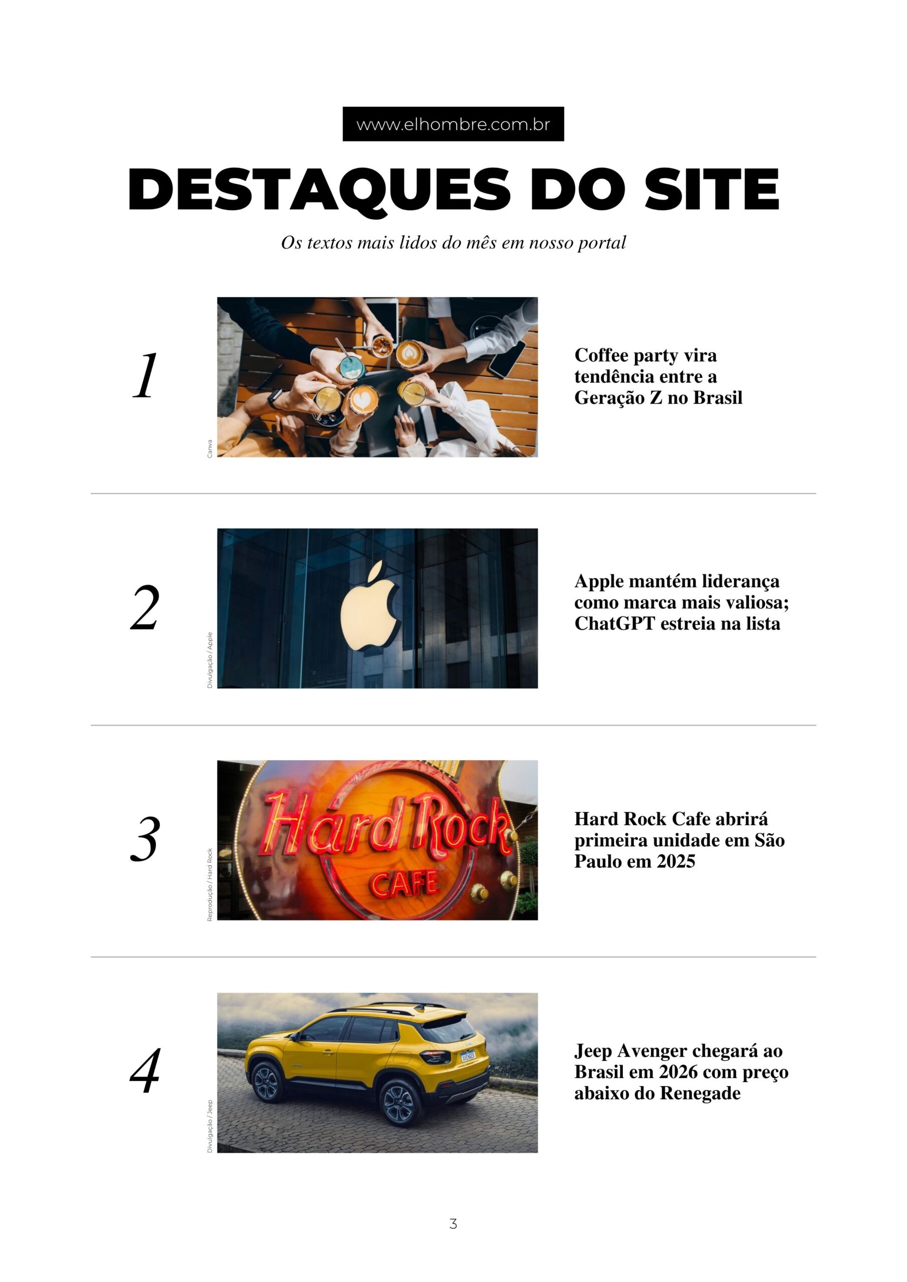 Olá, senhores. Sejam bem-vindos à edição #02 da ELH Magazine. Junho chegou trazendo temperaturas mais baixas e com ele preparamos uma seleção de temas que combinam perfeitamente com a estação. Começamos com uma lista de destinos turísticos para curtir o frio no Brasil — de Campos do Jordão (SP) a Gramado (RS), passando por Petrópolis (RJ) e Monte Verde (MG). No universo dos carros, destacamos o novo Volkswagen Tera, um SUV compacto que promete movimentar o mercado. Em estilo, revisitamos três jaquetas clássicas que atravessam gerações. E no cinema, Brad Pitt assume o volante no aguardado filme “F1”, gravado durante corridas reais da Fórmula 1. Também trazemos uma reflexão científica sobre como acordar mais cedo pode transformar sua saúde e produtividade. Boa leitura.