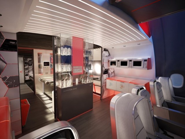 Enquanto um avião normal comporta de 100 a 400 passageiros, ele terá espaço para apenas 13 atletas, além de uma equipe de apoio, com quatro áreas distintas:
