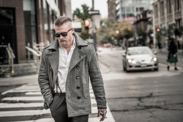 Tons escuros como preto, cinza, azul e marrom montam uma paleta de cores bastante característica. Na cabeça, um radical undercut, onde as extremidades são bem mais curtas do que o cabelo no topo.