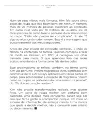 Esse pragmatismo se reflete, também, na forma como Kim usa perfume. Prefere fragrâncias leves, borrifadas sem cerimônia: de 10 a 20 sprays, aplicados em várias partes do corpo, para potencializar a projeção da fragrância. “Assim como as roupas, os perfumes são uma assinatura pessoal”, diz. “Os dois se complementam.”
