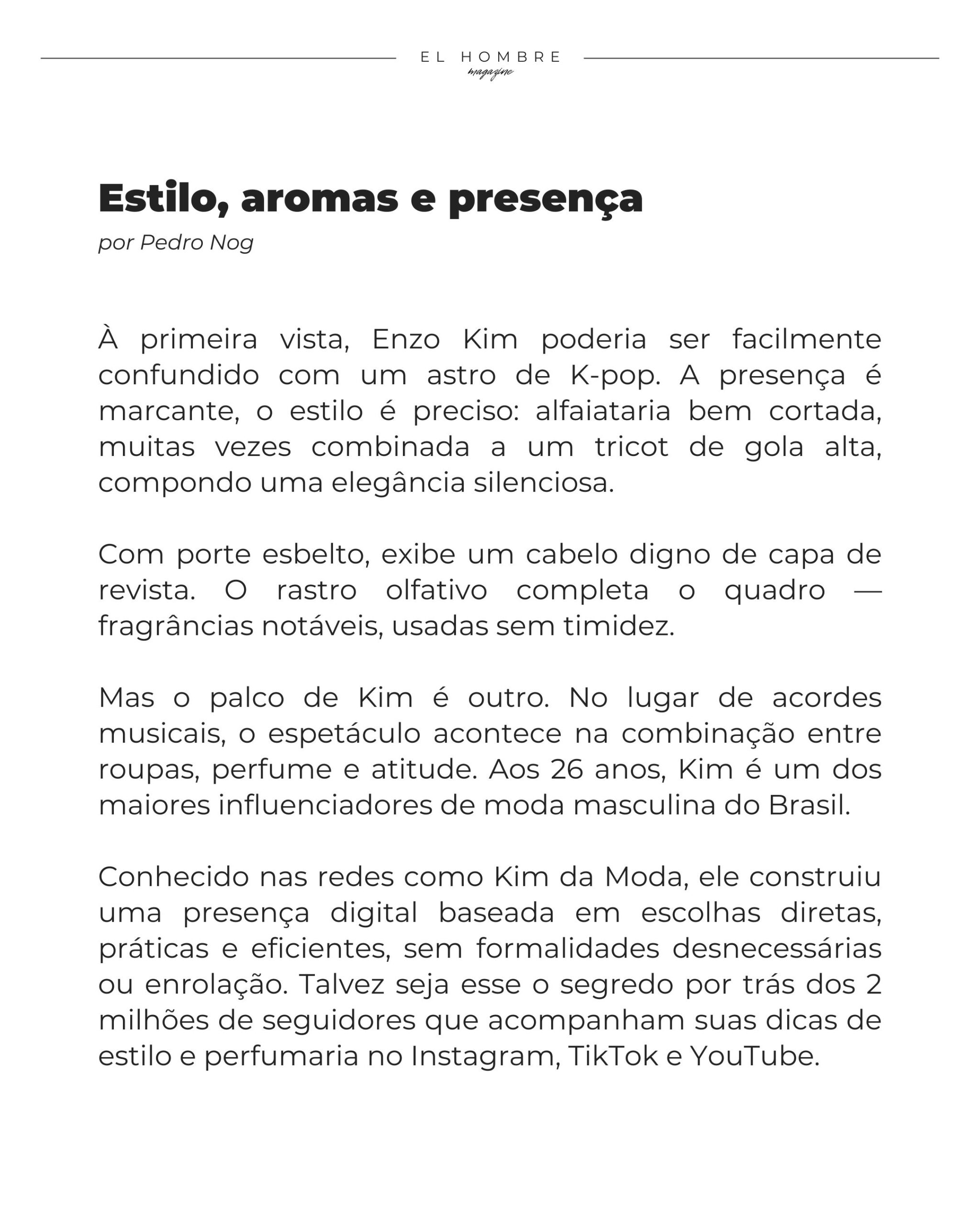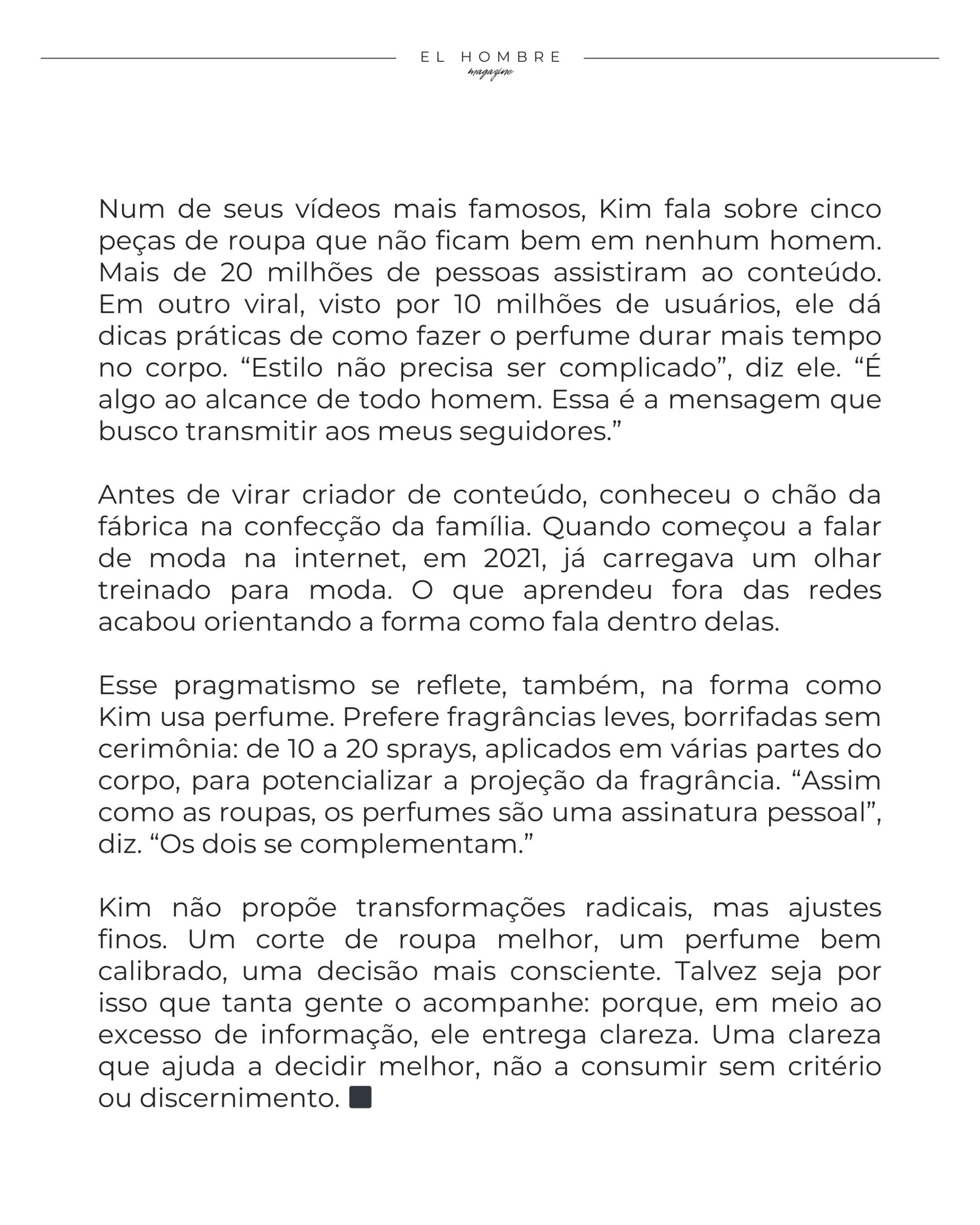 Kim não propõe transformações radicais, mas ajustes finos. Um corte de roupa melhor, um perfume bem calibrado, uma decisão mais consciente. Talvez seja por isso que tanta gente o acompanhe: porque, em meio ao excesso de informação, ele entrega clareza. Uma clareza que ajuda a decidir melhor, não a consumir sem critério ou discernimento. ◼︎