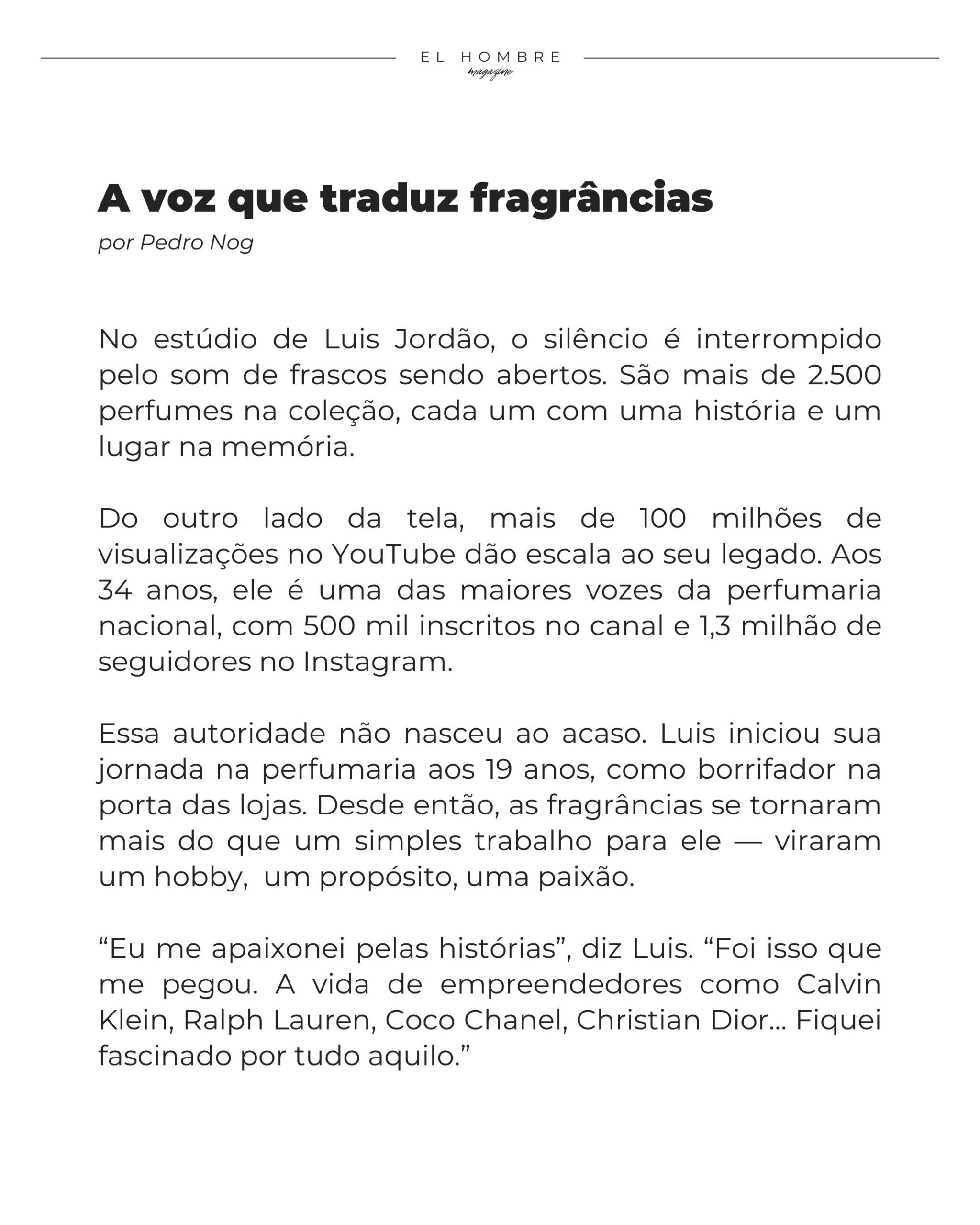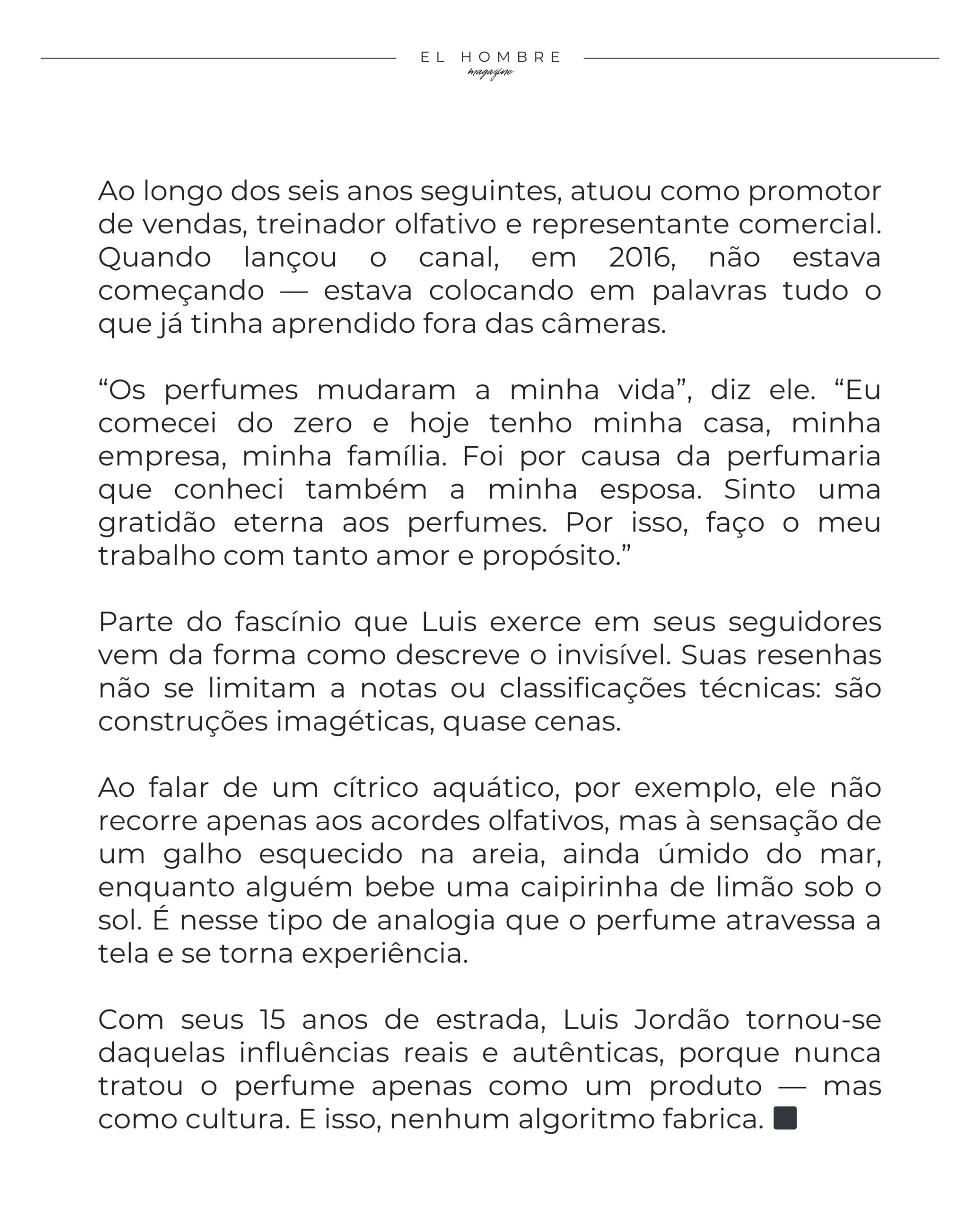Com seus 15 anos de estrada, Luis Jordão tornou-se daquelas influências reais e autênticas, porque nunca tratou o perfume apenas como um produto — mas como cultura. E isso, nenhum algoritmo fabrica. ◼︎