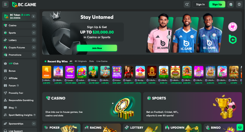O BC.Game está entre os cassinos de Bitcoin mais antigos em operação, ativo desde 2017 com sede em Belize. A plataforma pertence à Small House B.V./BlockDance B.V., que possui uma Anjouan Gaming License (ALSI-202410011-FI1) além de uma sublicença de Curaçao. Sete anos de operação construíram uma reputação excepcional por pagamentos instantâneos confiáveis, sem escândalos relevantes de processamento. O BC.Game apresenta uma enorme biblioteca de mais de 10.000 jogos de mais de 90 provedores, incluindo Evolution, Pragmatic Play, NetEnt e Microgaming. A plataforma oferece jogos exclusivos BC Original (Crash, Plinko, Classic Dice) com tecnologia provably fair e um sportsbook abrangente cobrindo grandes ligas esportivas e eSports. O processo de saque leva aproximadamente 5 minutos em média.