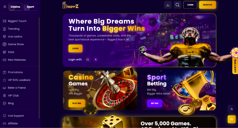 O BiggerZ é o cassino de Bitcoin mais novo deste artigo, lançado em novembro de 2024 pela CDK PLAY INC SRL (registro: 3-102-819705). A plataforma opera sob licença da Anjouan Gaming Commission (ALSI-2023602493-11). Apesar de ser totalmente novo, o BiggerZ impressionou os primeiros usuários com saques instantâneos, sem atrasos de processamento ou períodos de espera segundo reviews. A plataforma possui mais de 5.800 jogos de cassino, incluindo slots, dealers ao vivo, jogos de mesa e crash games de provedores certificados. O BiggerZ oferece depósitos em criptomoedas instantâneos e saques totalmente instantâneos, sem qualquer período de aprovação. A plataforma inclui um sportsbook completo, jogos de cassino e termos transparentes, com ferramentas claras de jogo responsável, incluindo autoexclusão (mínimo de 6 meses) e períodos de resfriamento de 7 dias.