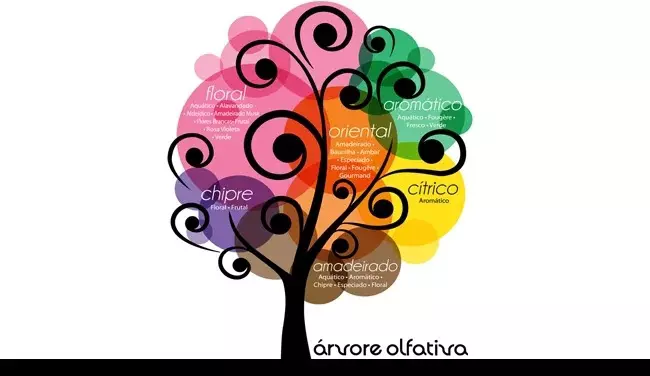 Na árvore olfativa de Renata Ashcar, as fragrâncias são organizadas em 6 grandes famílias principais: