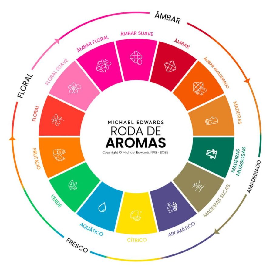 Uma das interpretações mais influentes da perfumaria contemporânea é a proposta pelo especialista britânico Michael Edwards. Diferente do modelo linear, ele organiza as fragrâncias em uma Roda Olfativa, na qual as categorias se conectam de forma gradual.