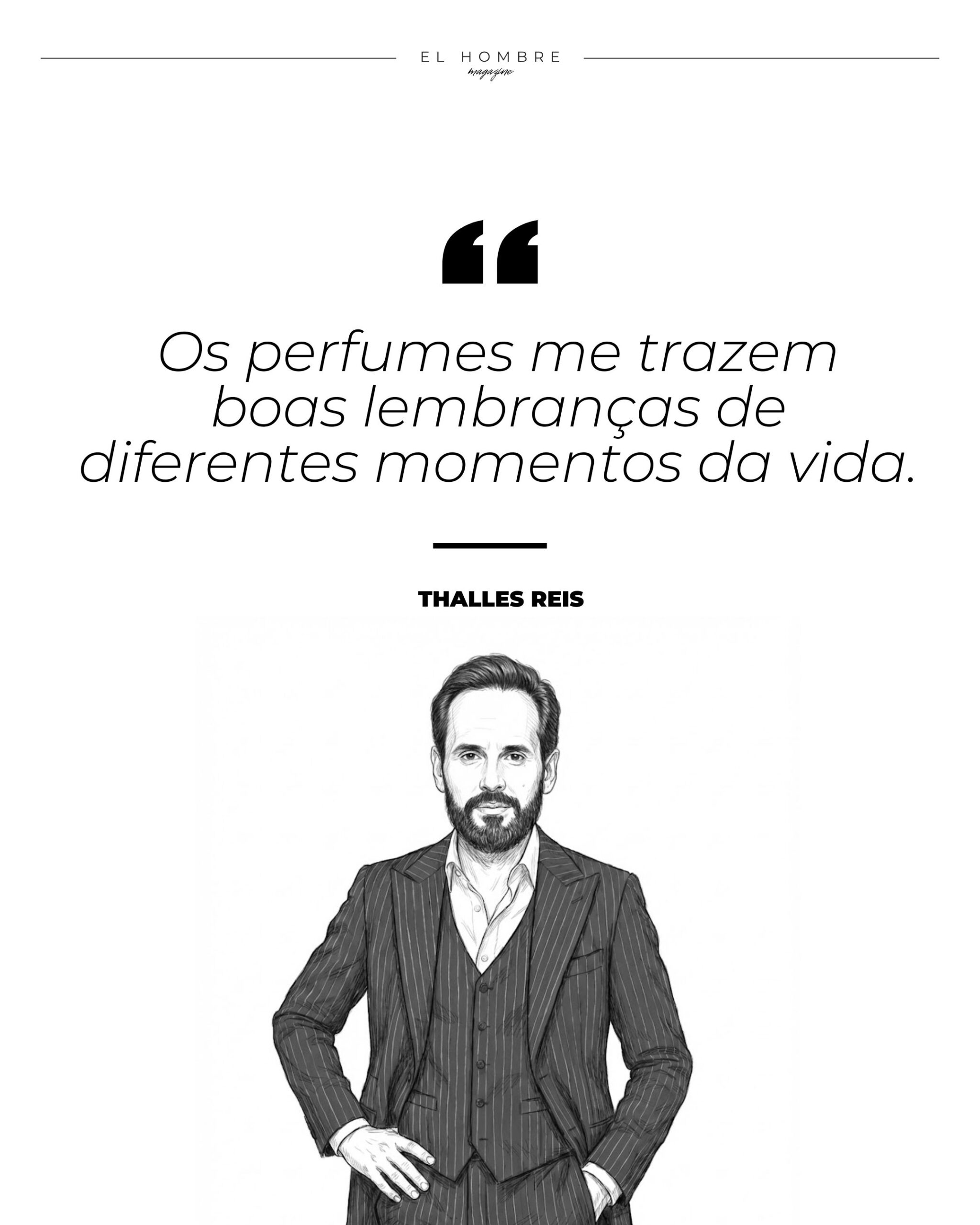 “Os perfumes me trazem boas lembranças de diferentes momentos da vida”, diz Thalles. “É uma forma de revisitar o tempo.” Atualmente, seus preferidos são o Imagination (Louis Vuitton), o Side Effect (Initio) e o Prodigy (Mind Games). Em breve, deseja acrescentar o Torino21, da Xerjoff, à coleção. Essa relação com a perfumaria o levou a viajar para Dubai e Grasse, em busca de conhecer de perto esse universo. É um interesse que não se limita ao uso cotidiano, mas se estende também à origem das fragrâncias, aos processos criativos e às histórias que existem por trás de cada perfume.