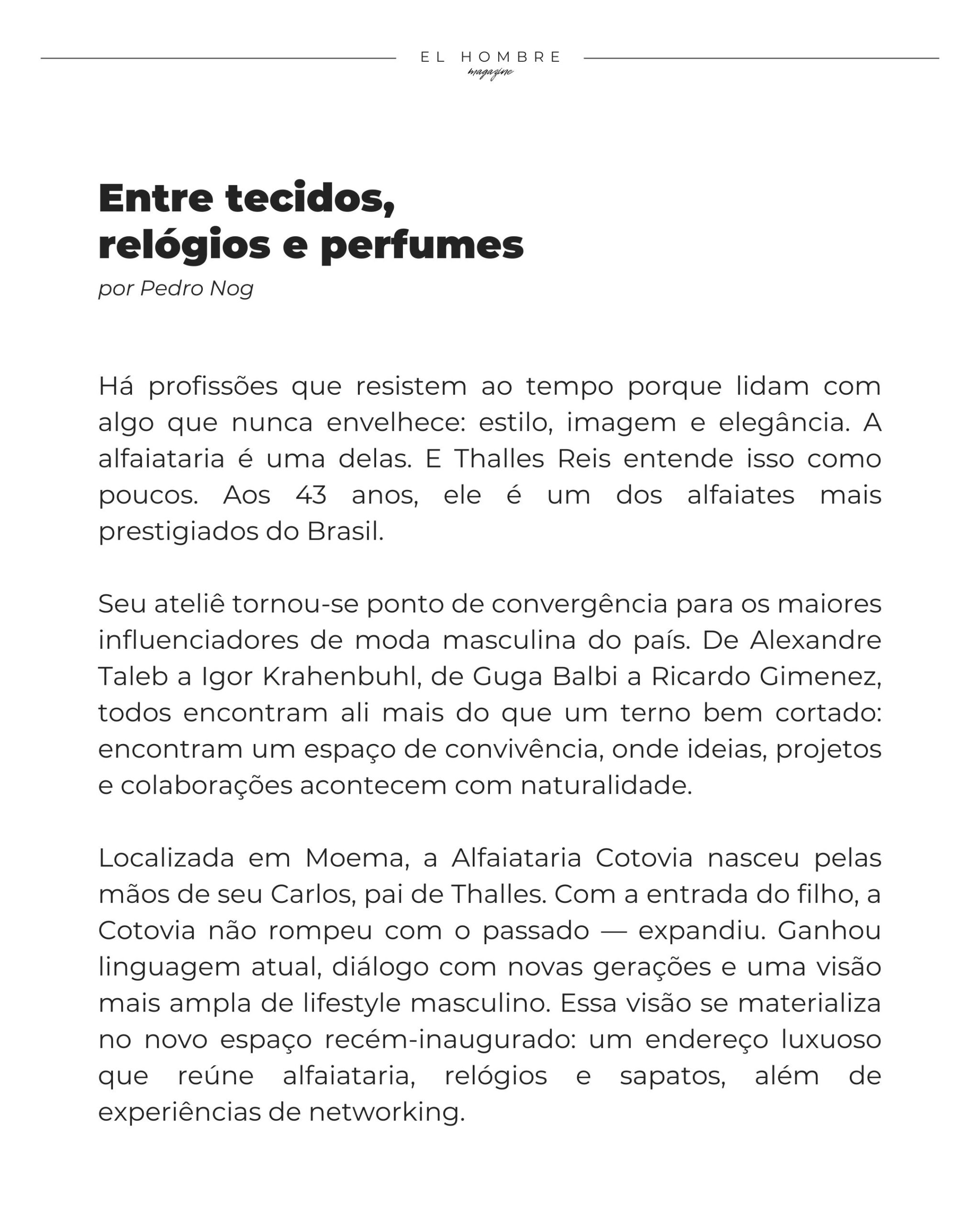 Localizada em Moema, a Alfaiataria Cotovia nasceu pelas mãos de seu Carlos, pai de Thalles. Com a entrada do filho, a Cotovia não rompeu com o passado — expandiu. Ganhou linguagem atual, diálogo com novas gerações e uma visão mais ampla de lifestyle masculino. Essa visão se materializa no novo espaço recém-inaugurado: um endereço luxuoso que reúne alfaiataria, relógios e sapatos, além de experiências de networking.