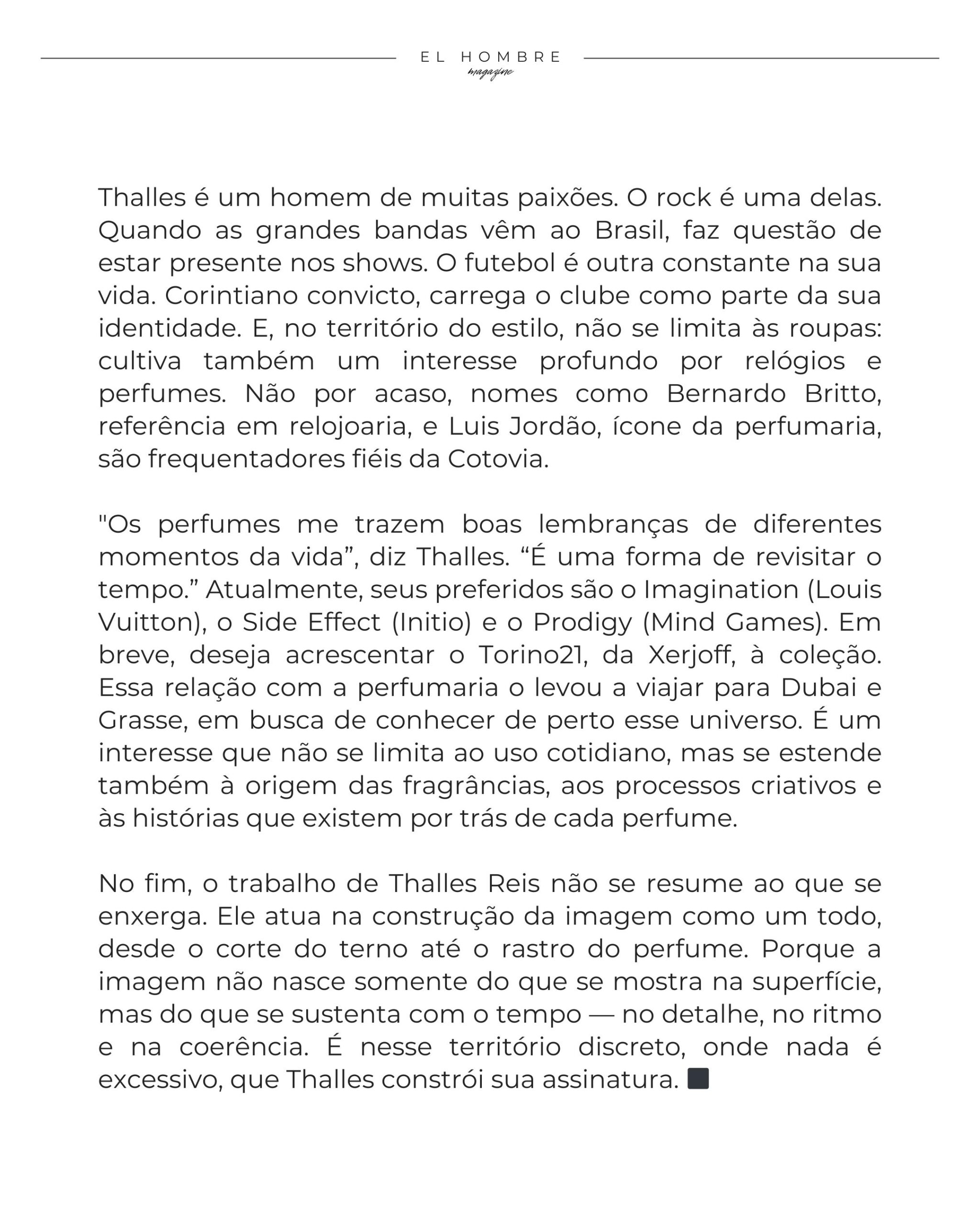 Thalles é um homem de muitas paixões. O rock é uma delas. Quando as grandes bandas vêm ao Brasil, faz questão de estar presente nos shows. O futebol é outra constante na sua vida. Corintiano convicto, carrega o clube como parte da sua identidade. E, no território do estilo, não se limita às roupas: cultiva também um interesse profundo por relógios e perfumes. Não por acaso, nomes como Bernardo Britto, referência em relojoaria, e Luis Jordão, ícone da perfumaria, são frequentadores fiéis da Cotovia.