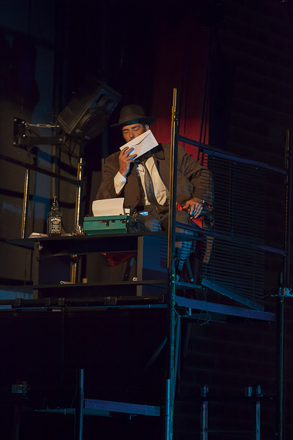 Explico: há um escritor bêbado e depravado, com voz de detetive dos anos 40, que vai comentando cada apresentação da noite.
